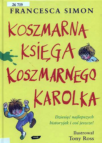 Koszmarna księga Koszmarnego Karolka / Francesca Simon ; ilustrował Tony Ross ; tłumaczyła Maria Makuch. - Wydanie I, dodruk. - Kraków : Wydawnictwo Znak, 2006. - 158, [2] strony ; ilustracje kolorowe ; 22 cm.