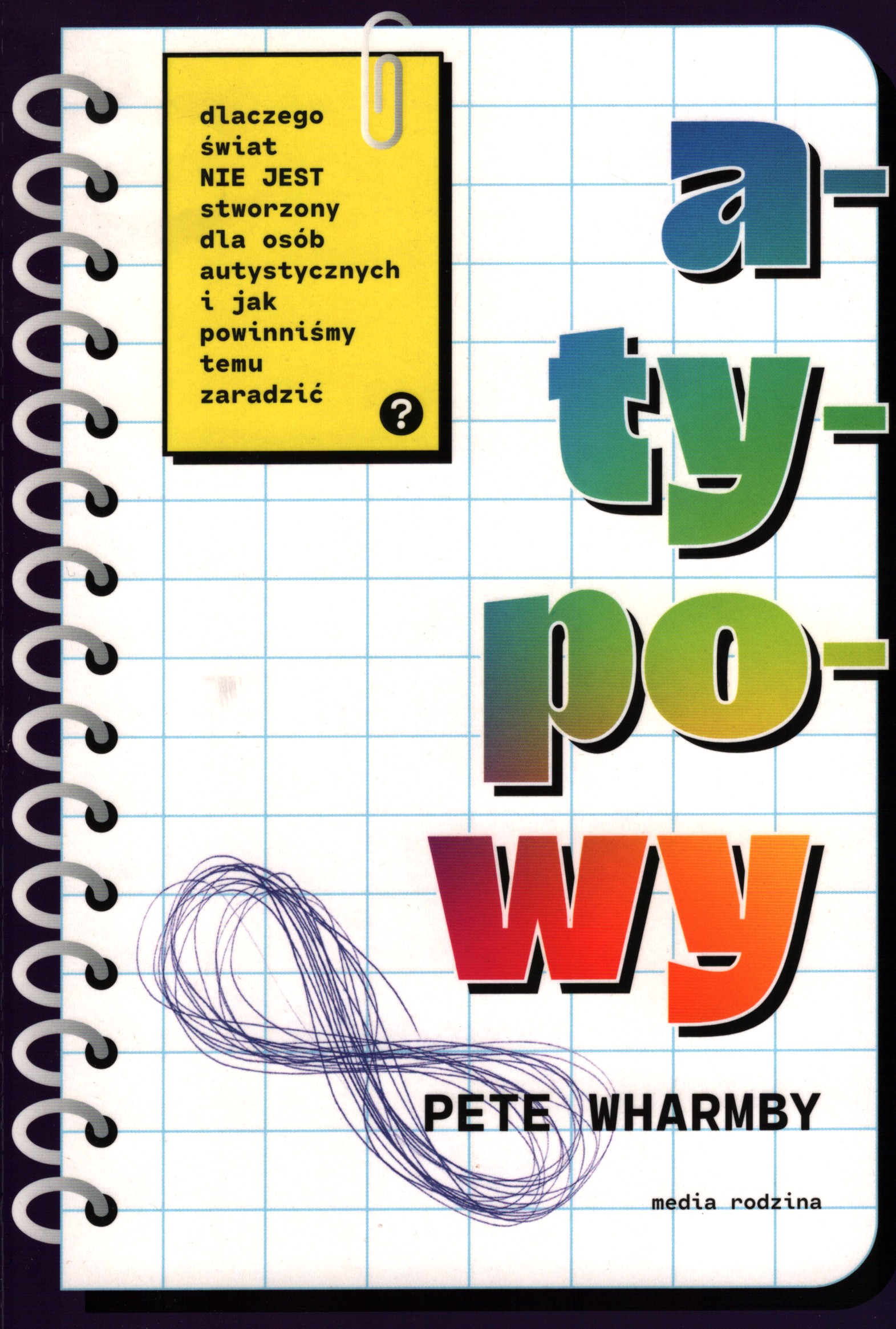 Nadszedł czas, aby przebudować świat – to hasło przewodnie tej przełomowej książki, która opisuje kroki, jakie powinniśmy podjąć, by wesprzeć osoby autystyczne, które spotykamy w naszym życiu. Współczesny świat nie jest stworzony dla osób neuroatypowych: niepotrzebny hałas, jasne migające światła, small talk, rozmowy telefoniczne, aluzje i niepisane zasady – dla osób autystycznych to może być koszmar. W książce "Atypowy" Pete Wharmby odsłania kulisy bycia „innym”, wyjaśniając za pomocą dowcipnych i ciepłych słów, jak męczące jest dopasowywanie się do świata, który nie został zaprojektowany dla ciebie. Książka ta oferuje jednak coś więcej niż tylko inny punktu widzenia. Po całym życiu spędzonym na maskowaniu swojej inności i otrzymaniu późnej diagnozy, Pete jest idealnym partnerem do rozmowy na temat tego, w jaki sposób nasze dwa światy mogą się spotkać i co możemy zrobić dla wielu autystycznych osób w naszych szkołach, miejscach pracy i życiu. Błyskotliwa, zabawna i przełomowa książka o tym, okazji jakie kroki powinniśmy , by uczynić świat bardziej przyjaznym dla naszych neuroróżnorodnych przyjaciół, krewnych i dla nas samych, a także apel do każdego, kto wierzy w społeczeństwo integracyjne i chce uczestniczyć w poszukiwaniu odpowiednich rozwiązań.