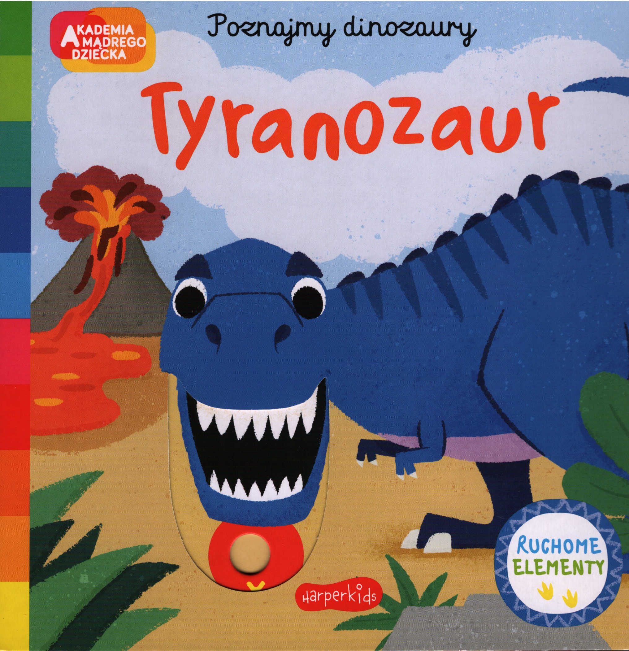 Akademia Mądrego Dziecka Poznajemy dinozaury to seria kartonowych książeczek z ruchomymi elementami dla małych wielbicieli prehistorycznych gadów. Na każdej stronie mały czytelnik znajdzie ciekawe fakty z życia dinozaurów. Tytuł Tyranozaur - czyli jeden z najgroźniejszych wielkich gadów przedstawia ciekawe fakty. Dowiadujemy się jak duży był ten dinozaur, jak wyczulony miał węch i jakie wielkie zęby miał w paszczy. Na każdej stronie mamy ruchomy element, co sprawia, że czytanie jest też zabawą pozwalającą ćwiczyć paluszki maluszkom.